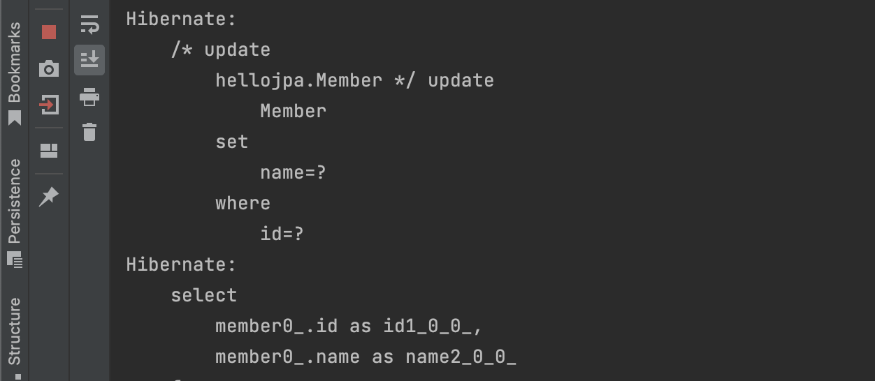 그러니까 이런식으로 코드를 짜면 안된다. em.update(member); 를 안 써도 이미 JPA에서는 update 쿼리가 날라간다.